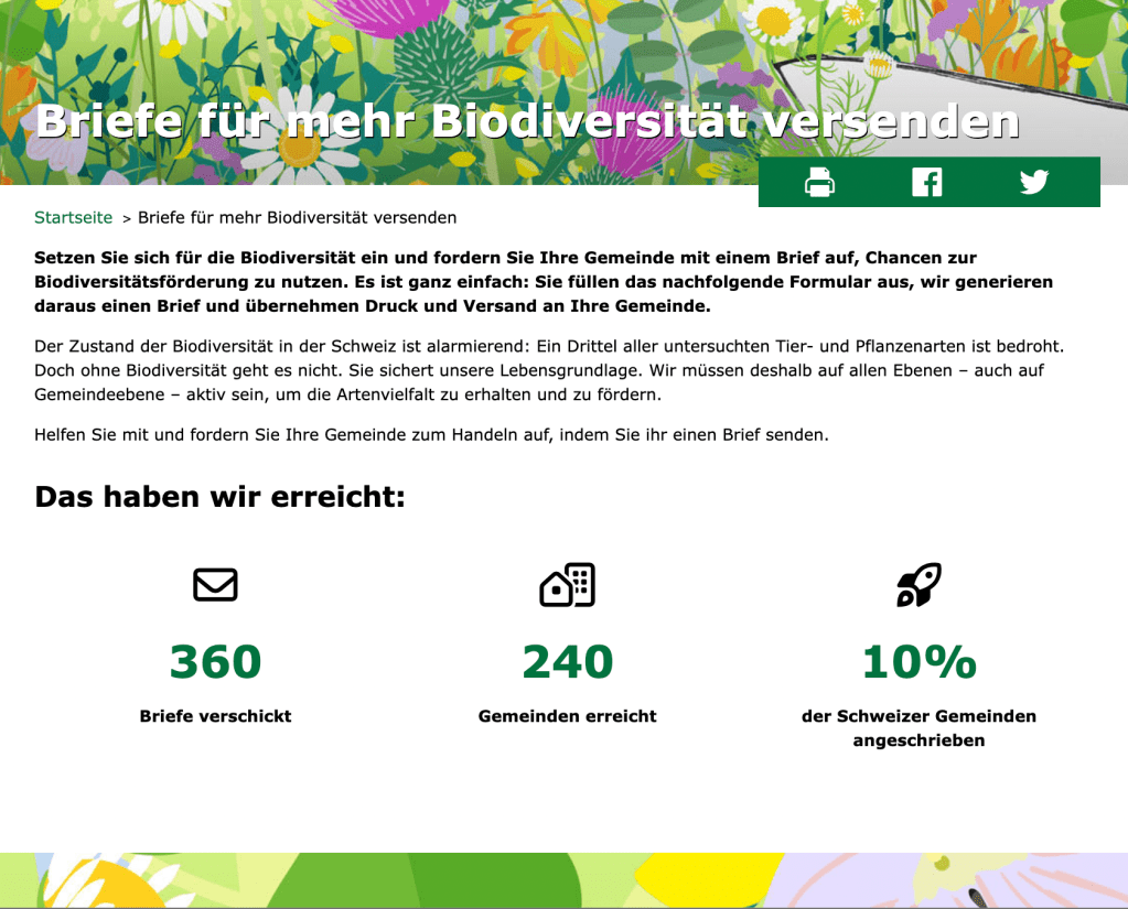 Umsetzung: Das Pro Natura Projekt «Biodiversität verpachten» hatte Schwierigkeiten, Gemeinden für eine mögliche Zusammenarbeit zu erreichen. Mit der Briefaktion haben wir unsere Community dazu motiviert, Briefe an ihre Wohngemeinden zu senden. Die Briefvorlage enthielt Vorschläge, wie sich Gemeinden für mehr Biodiversität einsetzen können. Der Brief konnte von den Absender/-innen online personalisiert werden und wurde nach einem Freigabeprozess durch uns automatisch gedruckt und an die entsprechende Gemeinde verschickt. Wir haben so 15% der deutschsprachigen Gemeinden erreicht und über 360 Briefe verschickt. Die Versandkosten konnten gut mit den freiwilligen Spendeneinnahmen der Absender/-innen gedeckt werden.